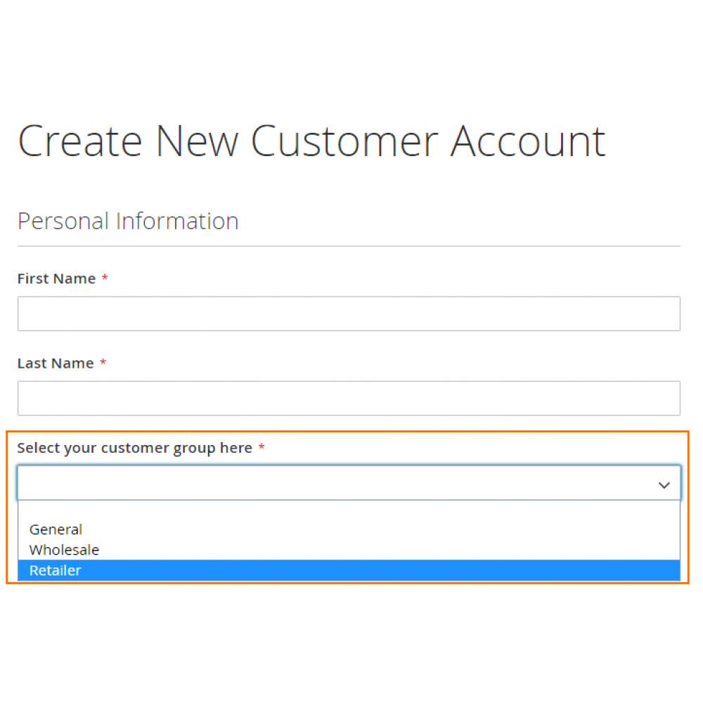 When this method is enabled in backend, customers see a dropdown on Registration and My account information edit page. They can choose the customer group they want to be associated to by selecting one of the available options from the dropdown.